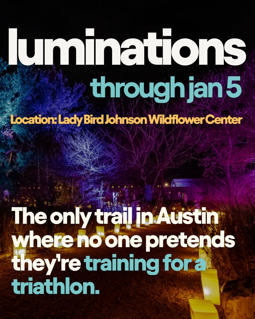 If you want something calmer than downtown chaos, Luminations is your move. The trails glow, the air feels softer, and the whole place turns into this quiet little pocket of wonder. It’s the rare Austin holiday event where you can actually hear yourself think. Perfect for date night or a reset night.