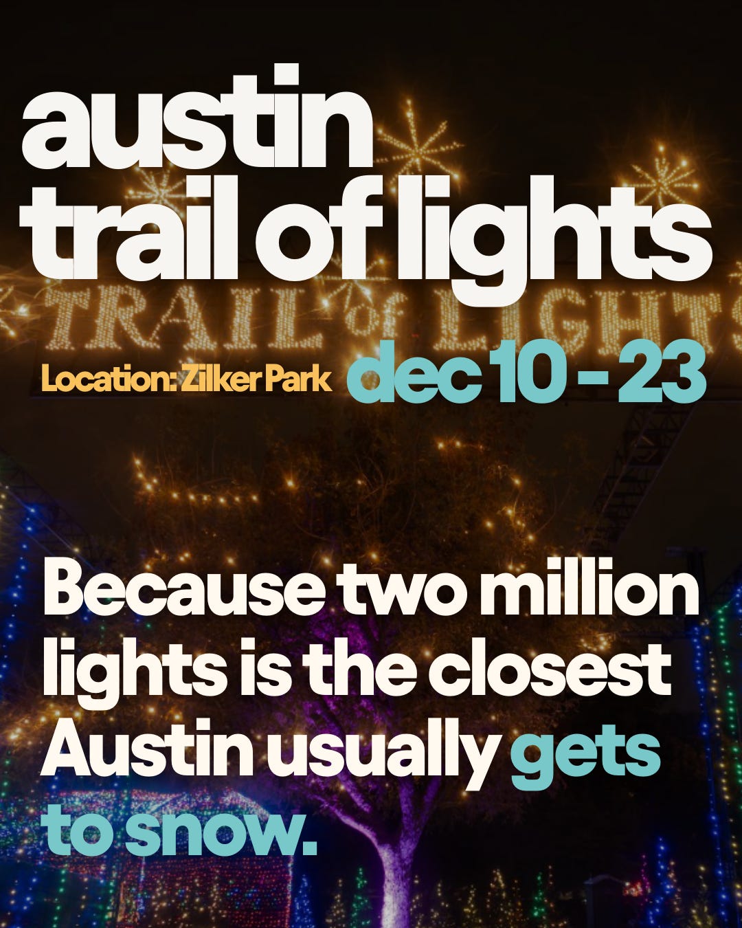 Austin’s most iconic walk-through event. Two million lights. Zero snow. A crowd ratio that feels like a small music festival. The magic is real though, especially once you accept the parking situation as a rite of passage.