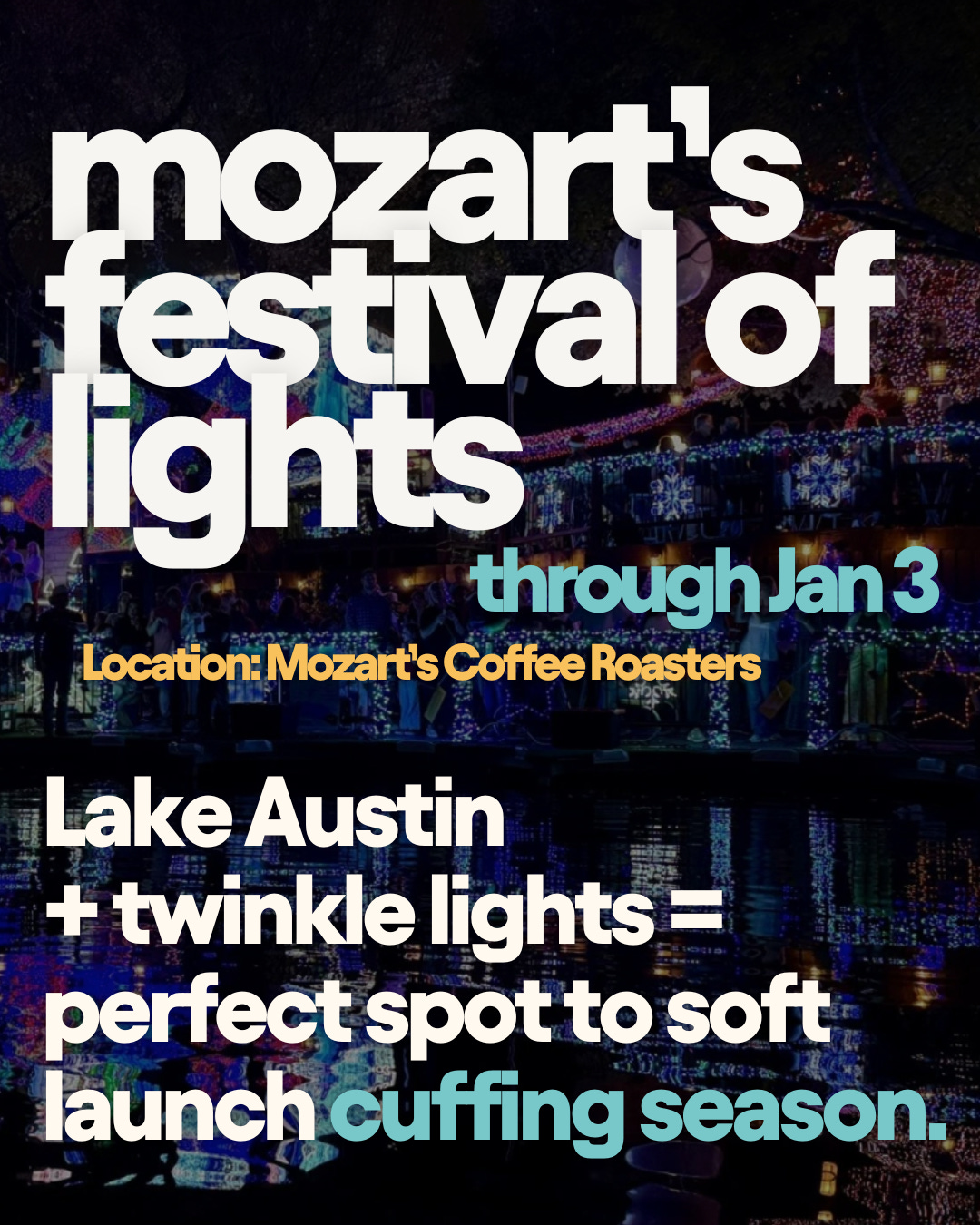 Twinkle lights reflecting on Lake Austin. Music. Cozy energy. Hot chocolate. It’s a soft-launch setting for cuffing season, so plan your date strategy accordingly.