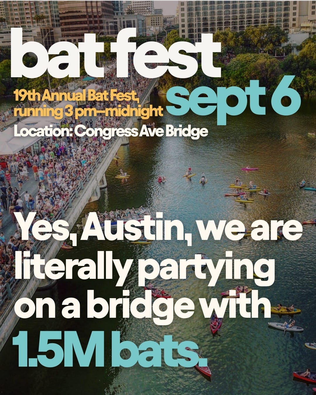 Yes, Austin, we are literally throwing a party on a bridge. Then, 1.5 million bats shoot out from under it like every scooter rider at last call.