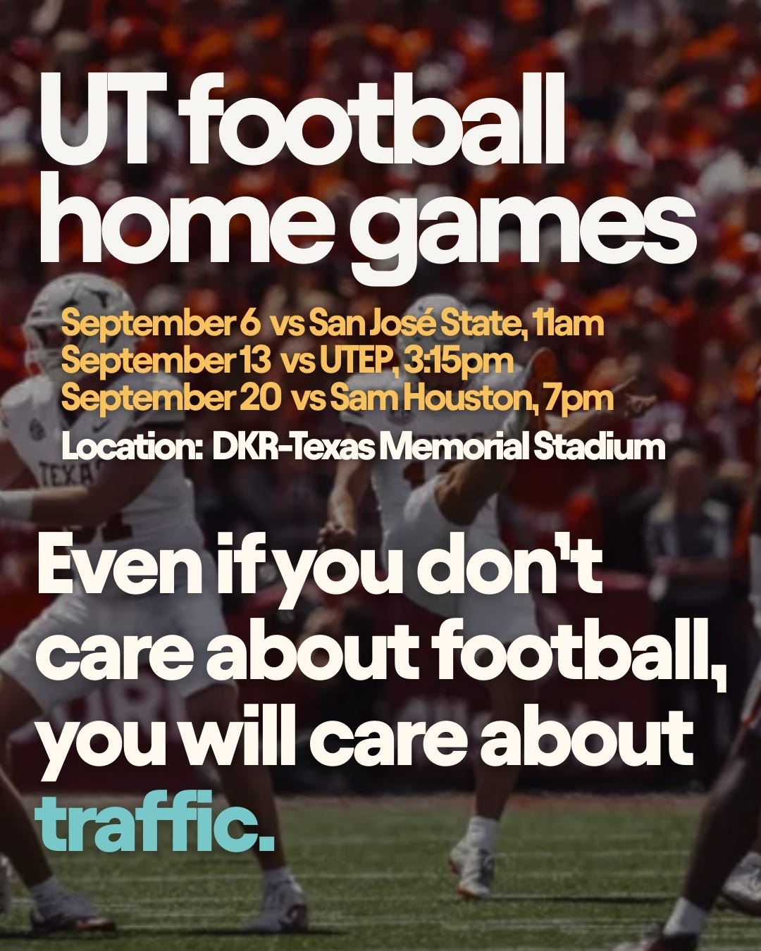 Even if you don’t care about football, you will care about traffic. Between burnt-orange tailgates, frat buses, and downtown gridlock, this is your warning.